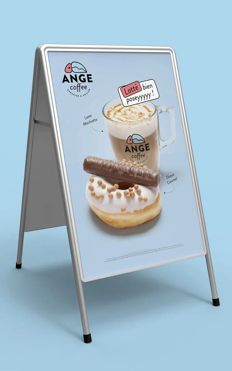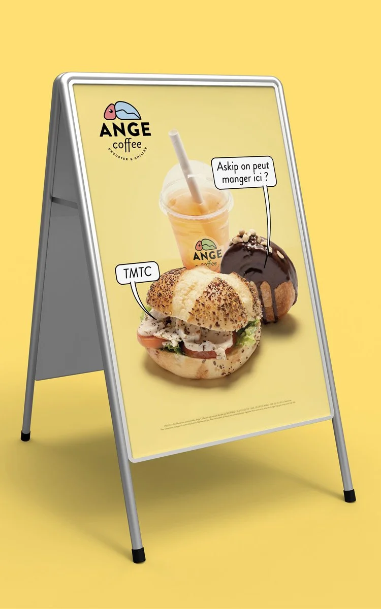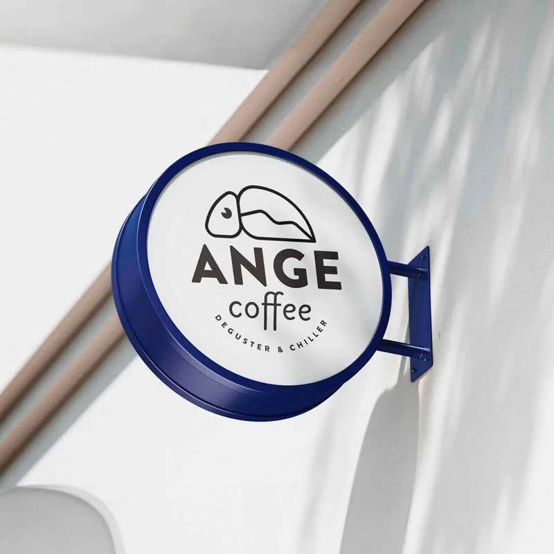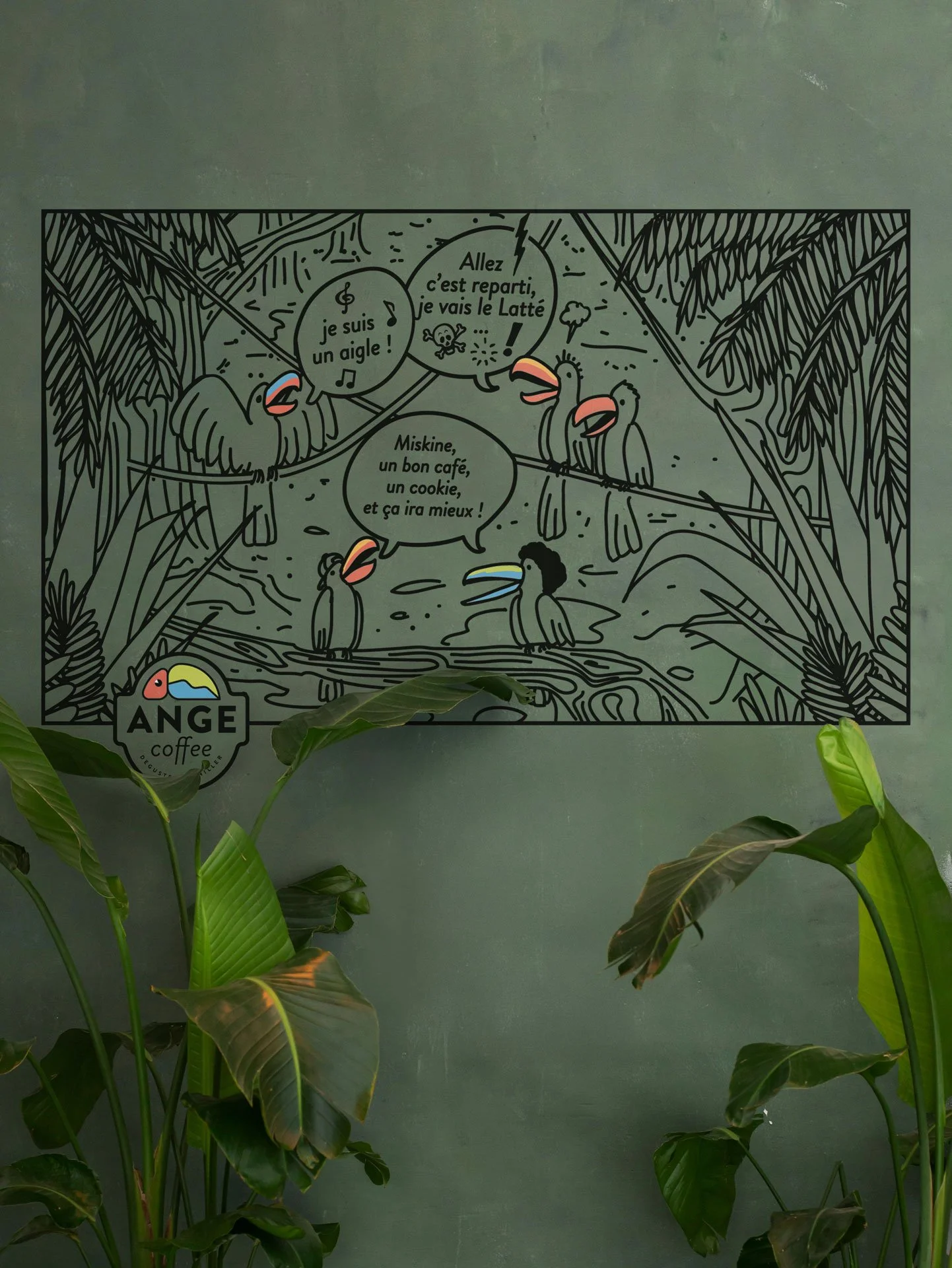 Le logo s'inspire du toucan, emblème d'Ange Coffee. Symbole de communication et de confiance, cet oiseau sociable reflète l'ambiance conviviale qui se crée au sein du magasin. J'ai revisité son bec afin d'y intégrer un grain de café, renforçant ainsi l'identité Barista de la marque. Le nom est accompagné d'une baseline qui illustre parfaitement l'univers et les valeurs qu'Ange Coffee souhaite transmettre.